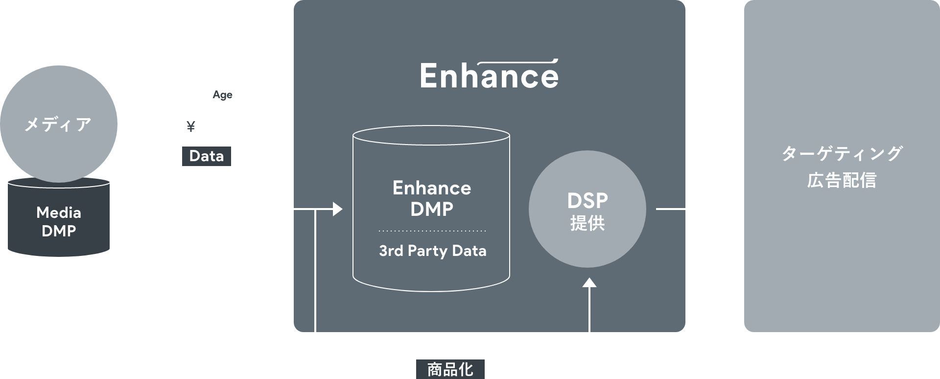 メディアDMPに蓄積した1stパーティデータを含むユーザーデータに対して、4億UBをほこるEnhanceDMPのデータを活用しながら、さらなるデータの意味づけ、整形を行い、プライベートなDSPを活用することで、メディア運営企業が自社のターゲティング広告商品として販売を行うための商品開発支援を行います。